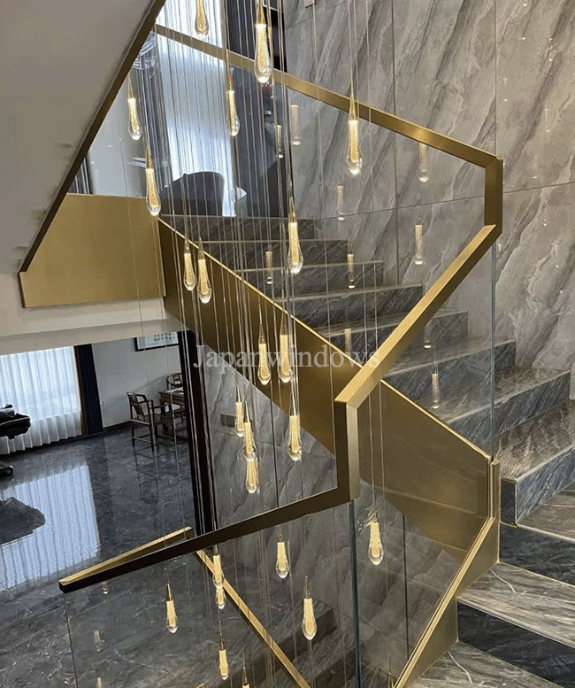 - Cầu thang kính cường lực tay vịn inox mạ vàng